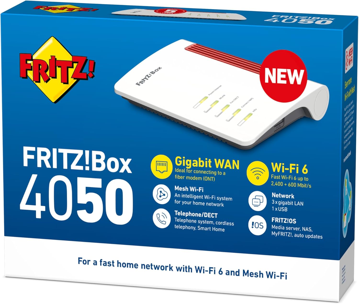 - FRITZ! AVM Box 4050 WLAN 6 Dual Band Router bis zu 3.000 Mbit/s, für Operator und ONT Modem, 1x Wan Gb, 3x Lan Gb, 1x USB, Access Point, Mesh, DECT, Medienserver, VPN, VOIP, FRITZ!OS, perfekt für Gaming, Streaming & Smart-Working