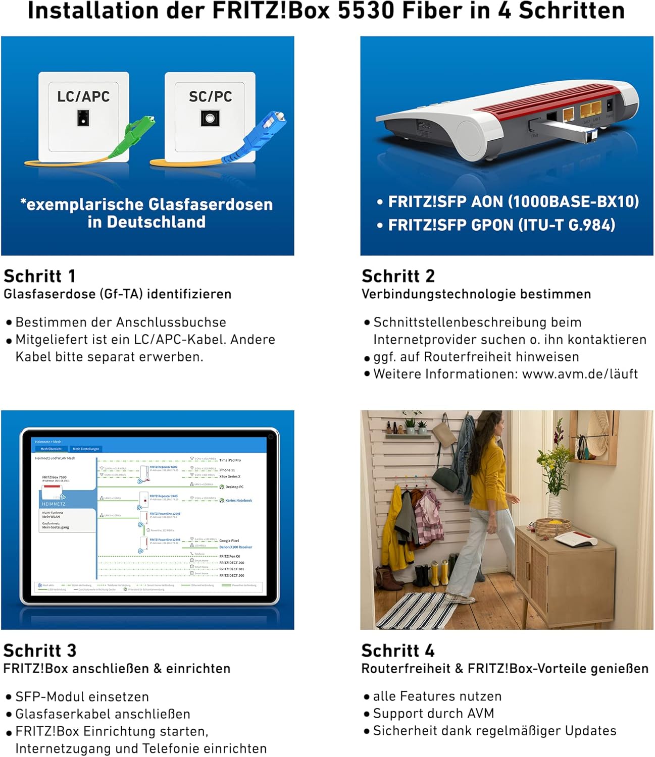 • Lieferumfang: FRITZ!Box 5530 Fiber, 1x FRITZ!SFP AON, 1x FRITZ!SFP GPON, Netzteil, 4m Glasfaserkabel (LC/APC – LC/APC), 1,5 Meter LAN-Kabel, Installationsanleitung
